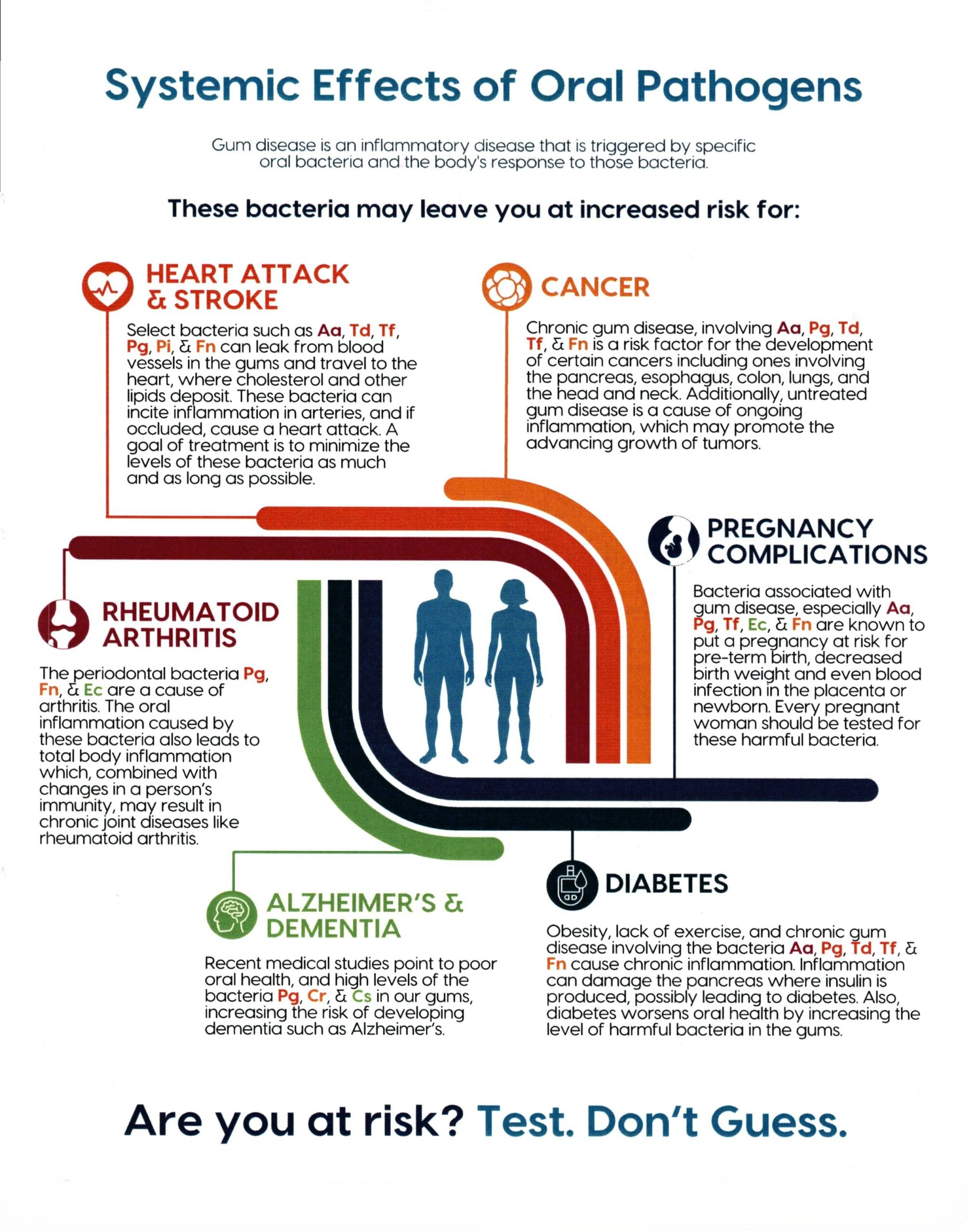 Not all oral pathogens respond to the same treatment. Some do not respond to many products or even deep cleanings/scaling, and root planing. Knowing what our patients are infected with allows us to personalize their treatment and gives them a better chance for success. When we see AA, PG, TD, or TF, or a combination of them, our patients’ treatment needs to be more aggressive since the infection is many times worse than with only one of them alone. We can also select our patients who may be immunosuppressed with diabetes, any kind of heart disease, or a history of stroke, and give them more aggressive treatment. The rise in inflammation in the body is not isolated from the increase in inflammation in the mouth, and many systemic diseases are known to be inflammatory diseases.